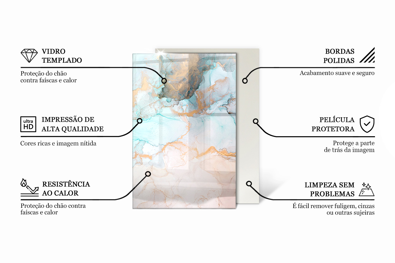 O produto é fabricado com cuidado nos detalhes. Uma impressão de alta qualidade, bordas lisas e pés de silicone são a garantia da sua satisfação. Como base de vidro para lareira, isola excelentemente o chão do calor e da sujidade. Pode mantê-la limpa muito facilmente, usando apenas um pano macio.