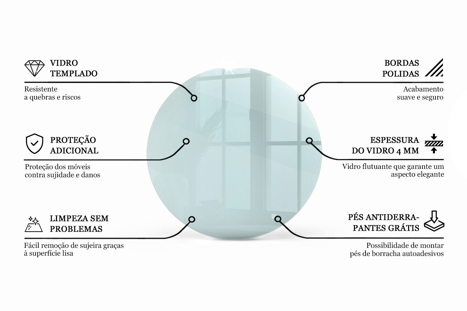 Introduza leveza e transparência moderna no seu interior com um tampo de mesa redondo transparente. Este detalhe ilumina a divisão e adiciona harmonia, sendo ideal para quem aprecia a simplicidade. O tampo redondo transparente transparente é excelente como tampo de mesa de centro ou proteção elegante para móveis. Feito de tampo em vidro temperado, é resistente e fácil de cuidar. Graças à sua transparência, este tampo de vidro combina perfeitamente com madeira e metal. Um design intemporal para a sua casa.